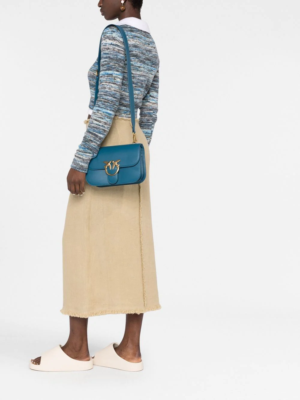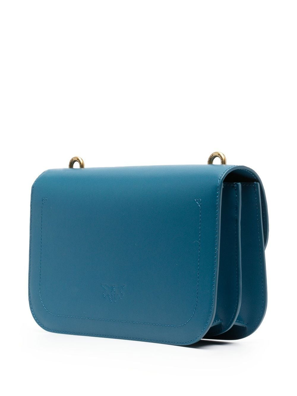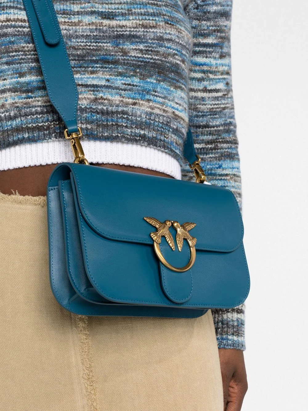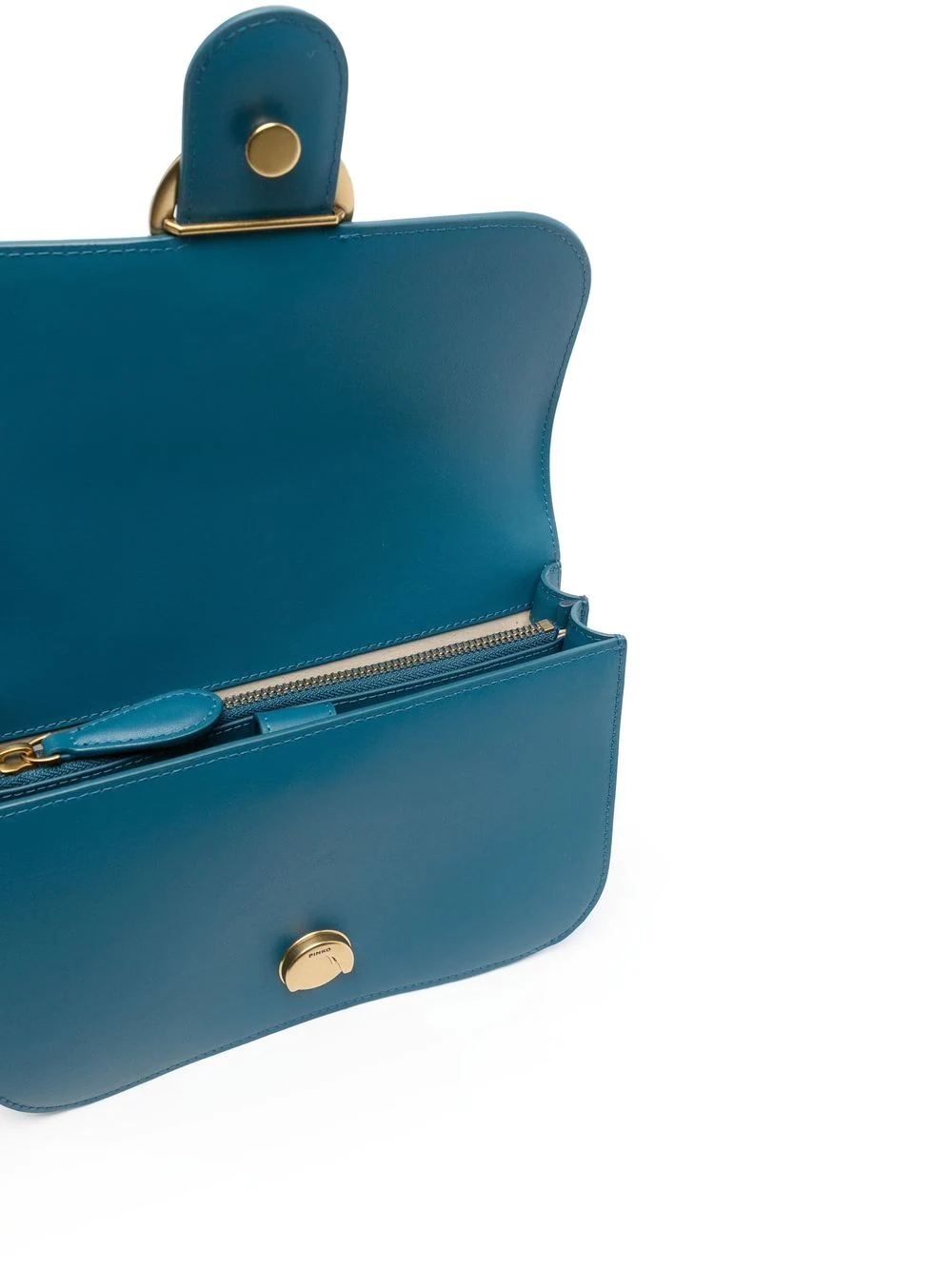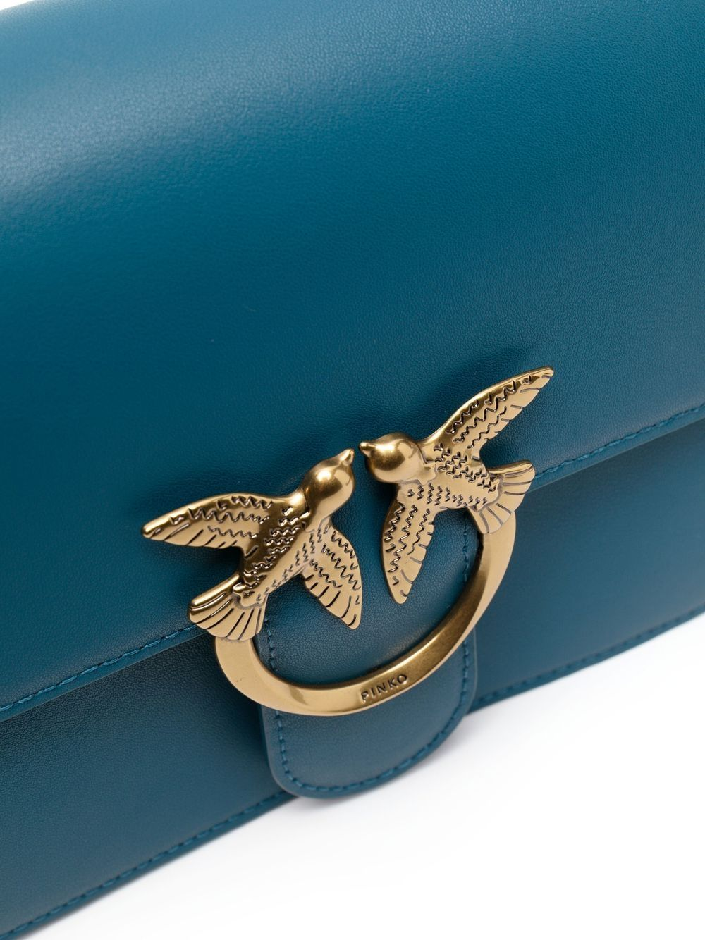 Кожаная сумка через плечо с металлическим логотипом PINKO, выполненная в бирюзово-синем цвете, мгновенно узнаваема благодаря золотистой табличке с логотипом, которая дополняется вышитой итерацией логотипа сзади для более тонкого подхода к брендингу.