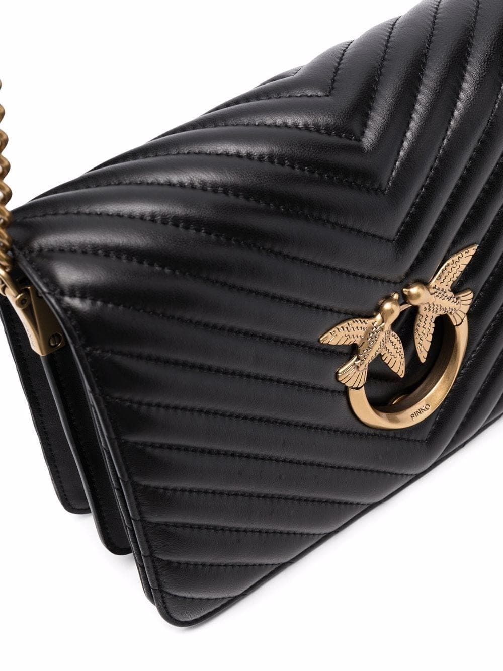 Сумка Classic Love Bag Click из стеганой кожи наппа с шевронным узором. Потайная магнитная застежка дополнена легендарной пряжкой Love Birds Diamond Cut из металла с гравировкой. Внутреннее отделение на подкладке из микрофибры дополнено карманом-перегородкой на молнии и плоским карманом из кожи. Плечевой ремень длиной 110 см представляет собой комбинацию металлической цепочки с квадратными звеньями и практичного регулируемого наплечника из кожи наппа.