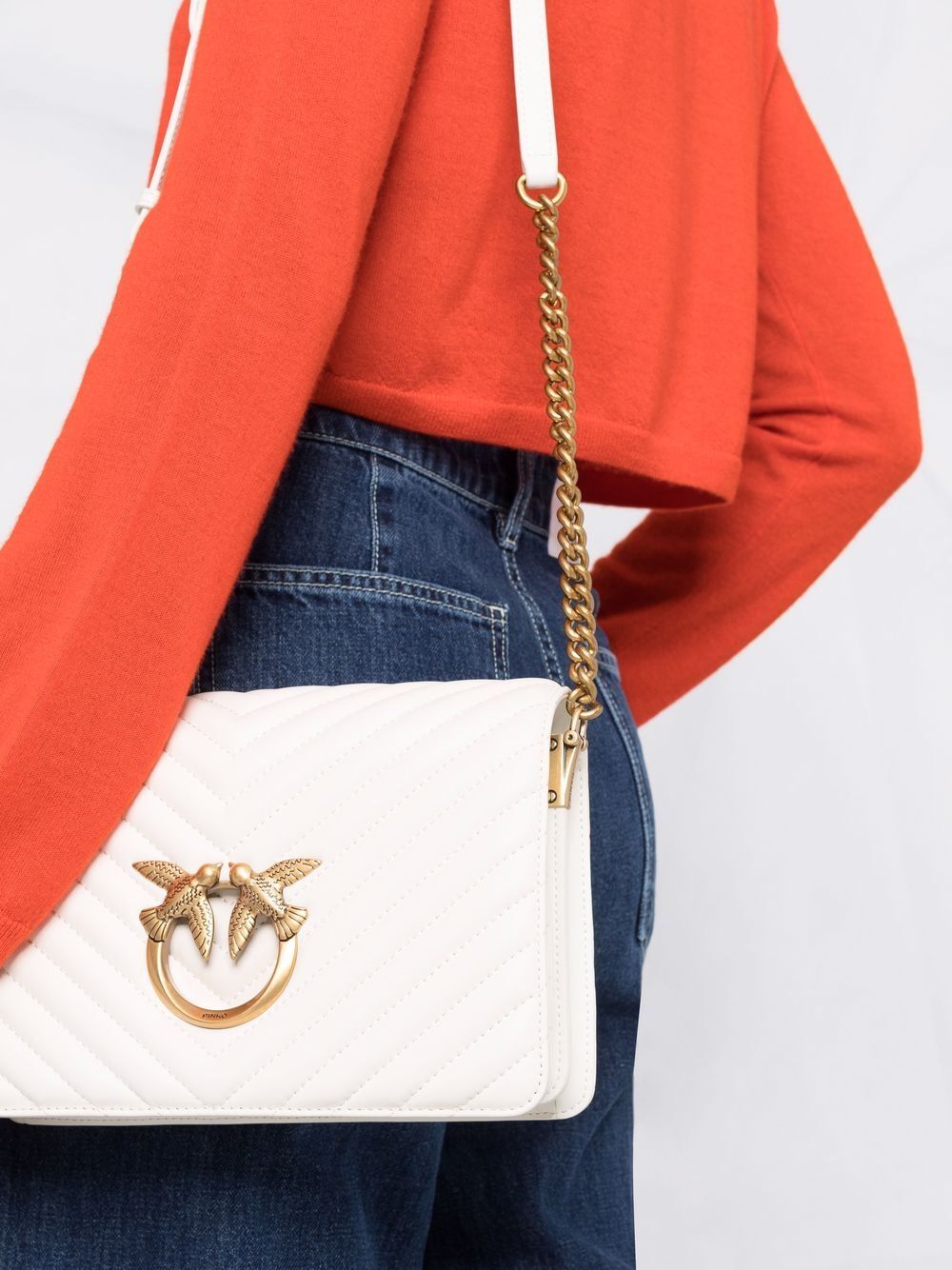 Сумка Classic Love Bag Click из стеганой кожи наппа с шевронным узором. Потайная магнитная застежка дополнена легендарной пряжкой Love Birds Diamond Cut из металла с гравировкой. Внутреннее отделение на подкладке из микрофибры дополнено карманом-перегородкой на молнии и плоским карманом из кожи. Плечевой ремень длиной 110 см представляет собой комбинацию металлической цепочки с квадратными звеньями и практичного регулируемого наплечника из кожи наппа.