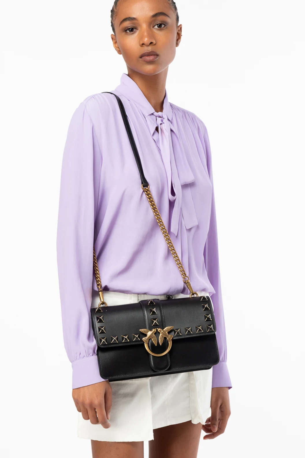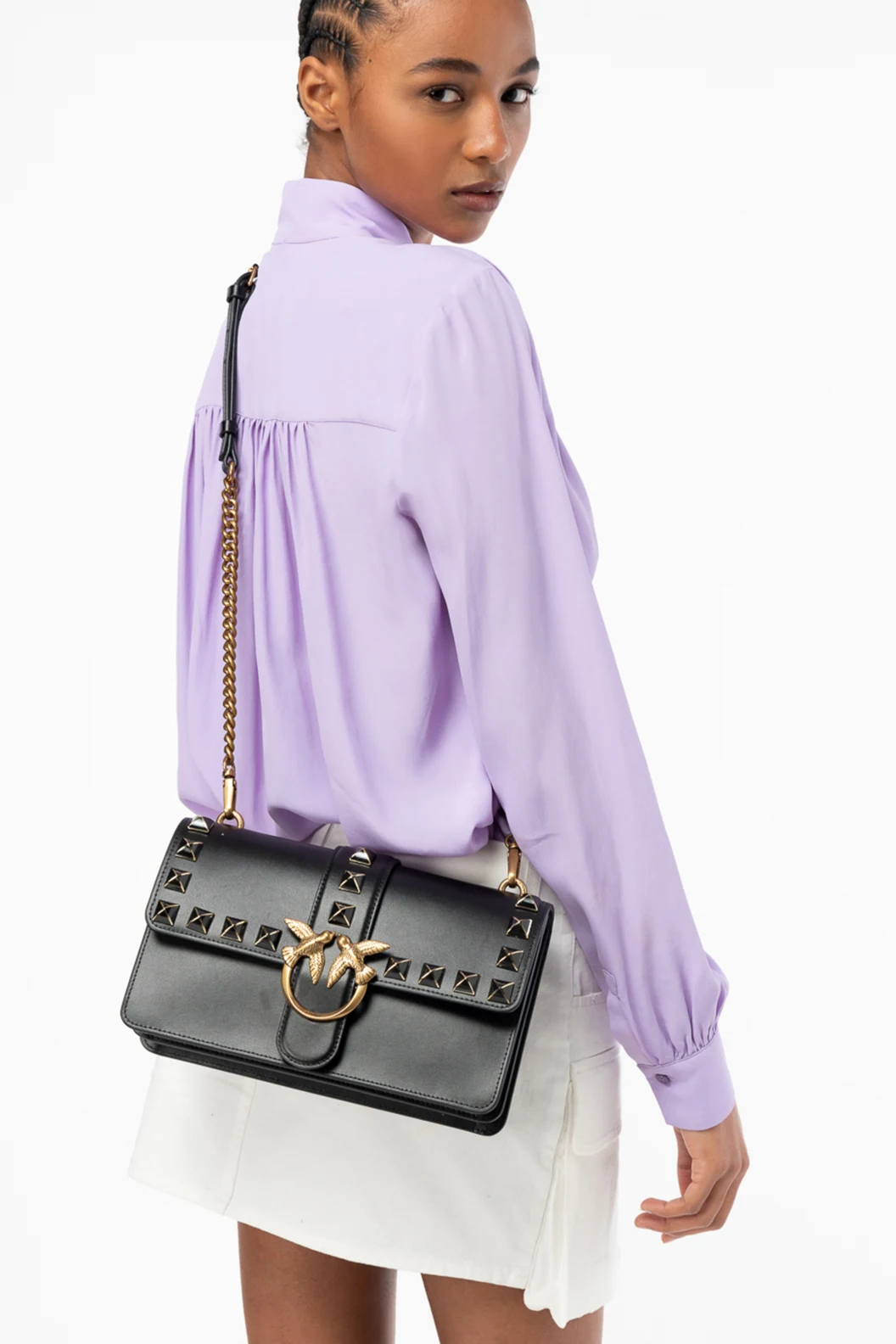 Эта сумка от PINKO из гладкой кожи украшена каменными заклепками и фирменной золотистой табличкой бренда.#nbsp;Благодаря структурированному силуэту он имеет разделенное отделение для оптимального использования.