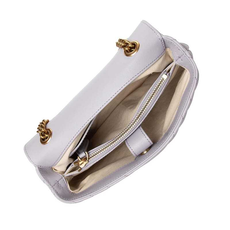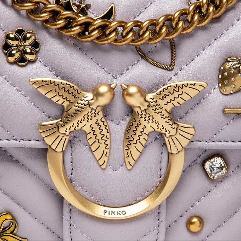 Мини-сумка Lady Love Bag Puff из стеганой кожи наппа с шевронным узором отличается декоративными значками спереди. Застежка украшена легендарной пряжкой Love Birds Diamond Cut из металла. Внутреннее отделение на подкладке из микрофибры дополнено карманом-перегородкой на молнии и плоским карманом. Плечевой ремень представляет собой комбинацию классической металлической цепочки с круглыми звеньями и практичного наплечника из кожи.