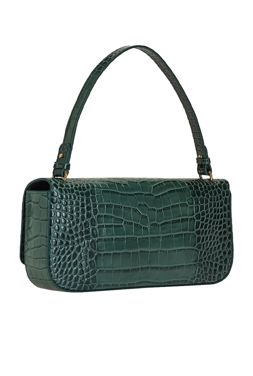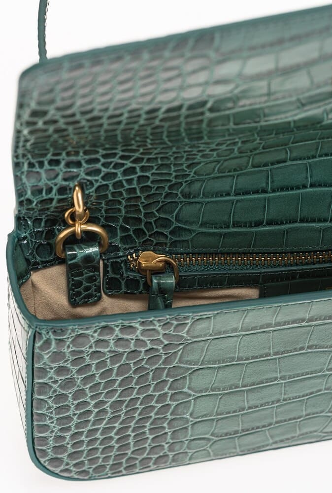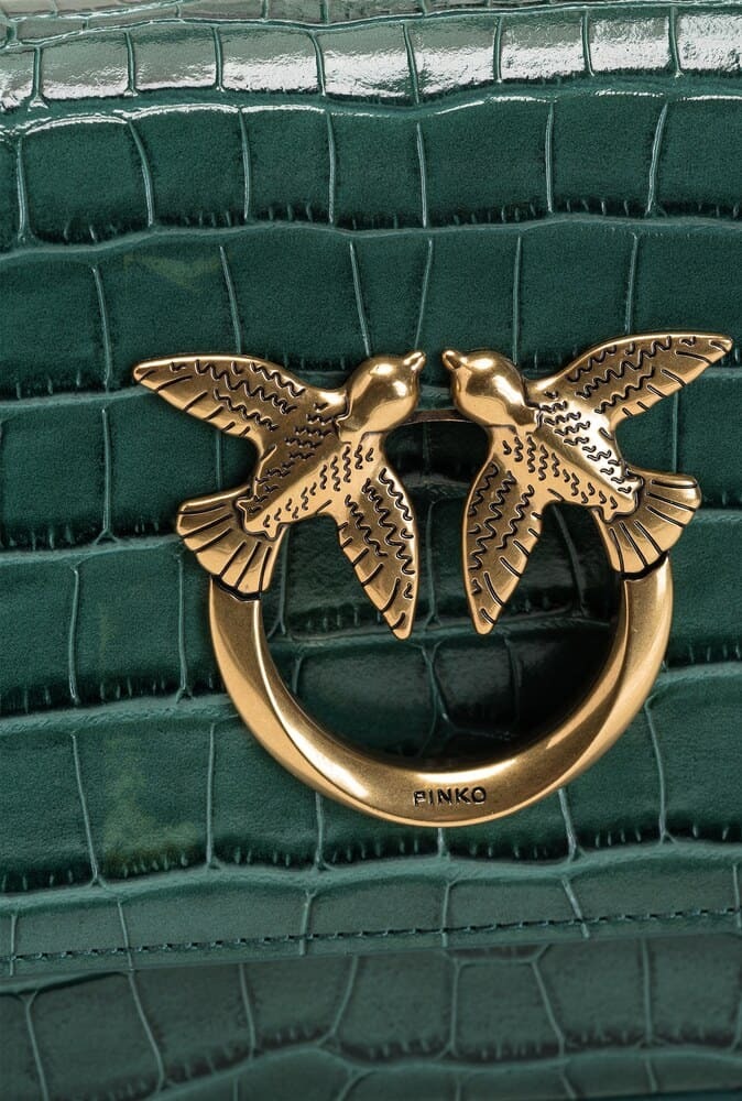 Сумка Love Bag Click Baguette удлиненного силуэта выполнена из кожи с тиснением под крокодила и особым эффектом блеска. Потайная магнитная застежка дополнена легендарной пряжкой Love Birds Diamond Cut из металла с декоративным вырезом. Внутреннее отделение на подкладке из микрофибры. Тонкий ремень-цепочка позволяет носить аксессуар на плече.