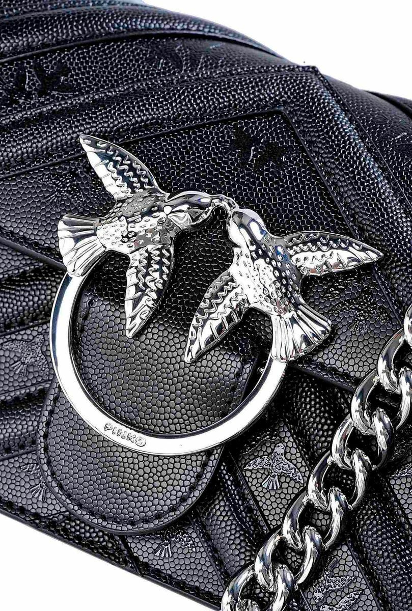 Сумка Love Bag из кожи особой фактуры, имитирующей икринки, с декором "шеврон" из нашитых кожаных полосок с тисненым рисунком ласточек Love Birds. Застежка дополнена легендарной пряжкой из металла с влюбленными ласточками Love Birds. Внутри сумка обшита подкладкой из ткани с эффектом кожи и снабжена карманом-средником на молнии с пуллером, украшенным фирменным декором-заклепкой в виде ласточки, и кожаным карманом на стенке. Плечевой ремень длиной 110 см представляет собой комбинацию классической цепочки из металла с практичным кожаным наплечником. Проверь подлинность своей Love Bag при помощи особого NFC-чипа.