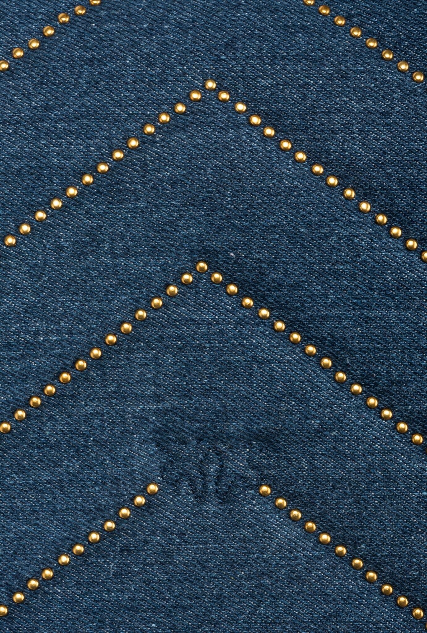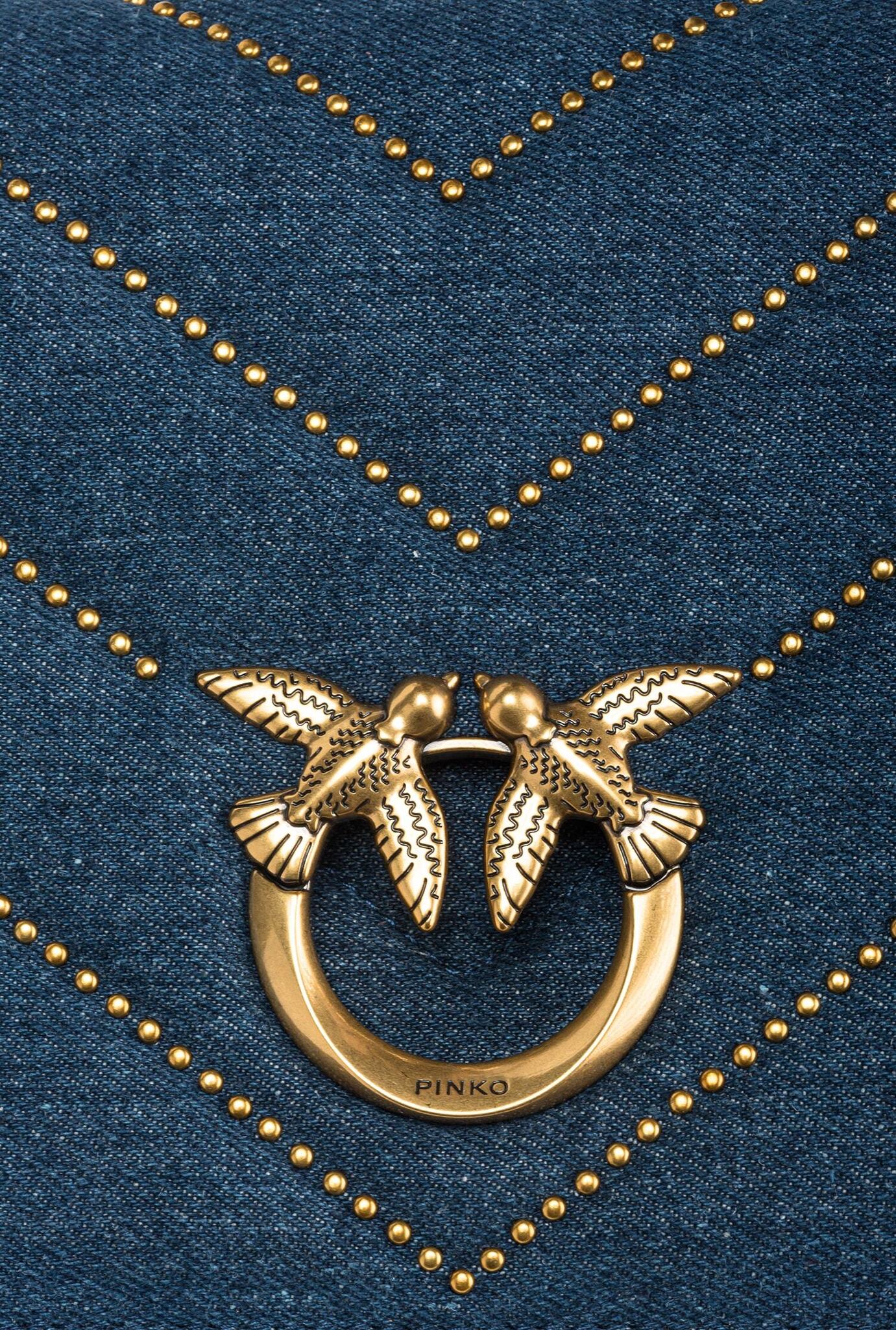 Сумка Mini Love Bag Click выполнена из денима со стеганым шевронным узором и декором из миниатюрных заклепок. Застежку на потайную кнопку украшает легендарная пряжка Love Birds Diamond Cut с декоративным вырезом, выполненная из металла с гальваническим покрытием цвета античного золота. Внутреннее отделение на подкладке из микрофибры с плоским карманом из кожи. Плечевой ремень представляет собой комбинацию классической металлической цепочки с круглыми звеньями и практичного регулируемого наплечника из кожи. Активируй свою сумку PINKO: поднеси смартфон к вышитому на задней стенке логотипу Love Birds, чтобы проверить подлинность изделия и получить доступ к персонализированным функциям!