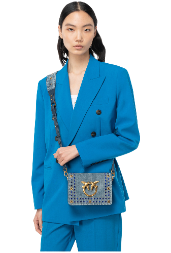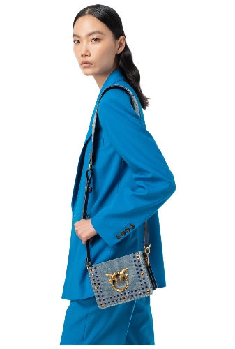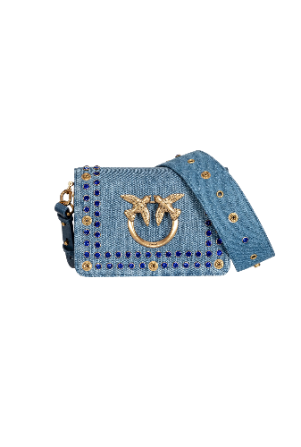 Мини-сумка Love Bag Click из денима с винтажным эффектом, обработанного по технологии стирки с камнями, декорирована стразами и заклепками. Застежка на потайную кнопку дополнена легендарной металлической пряжкой Love Birds Diamond Cut с декоративным вырезом. Внутреннее отделение на подкладке из микрофибры с замшевым эффектом. Регулируемый плечевой ремень из кожи со вставкой из денима, украшенный стразами и заклепками, отстегивается с помощью маленьких карабинов.