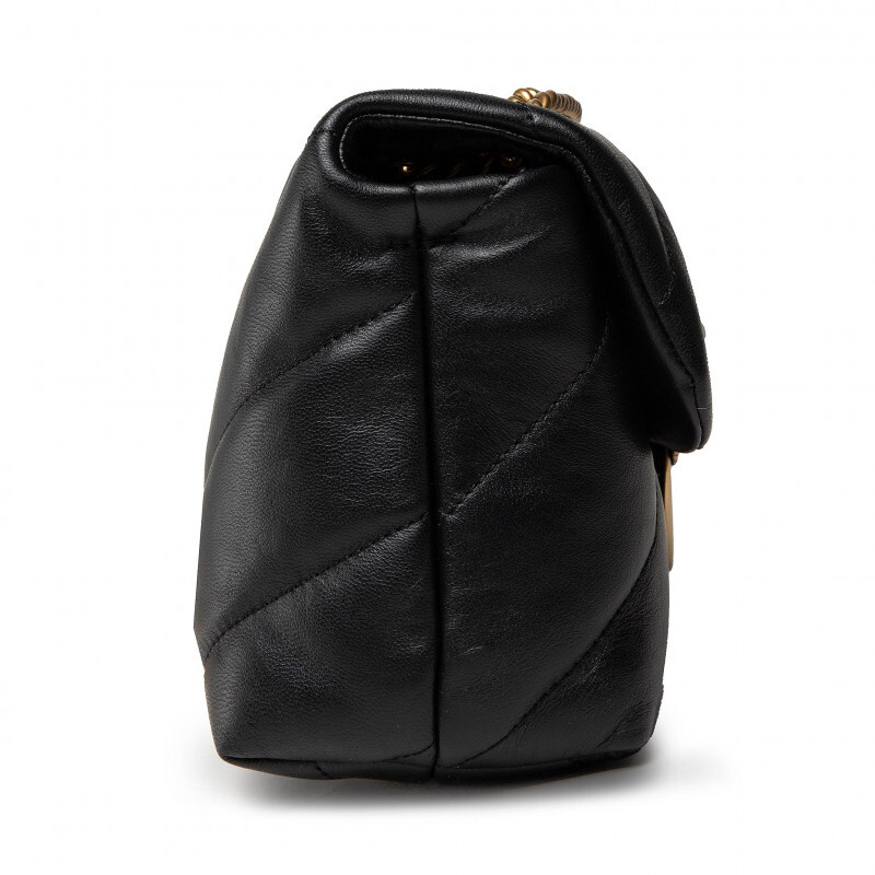 Сумка Mini Love Bag Puff из мягкой кожи наппа с крупной косой простежкой. Застежка дополнена легендарной металлической пряжкой Love Birds с гальваническим покрытием цвета античного золота. Внутри сумка обшита микрофиброй, разделена карманом-перегородкой на молнии и снабжена карманом на стенке. Плечевой ремень длиной 110 см представляет собой комбинацию классической металлической цепочки с круглыми звеньями и практичного наплечника из кожи наппа.