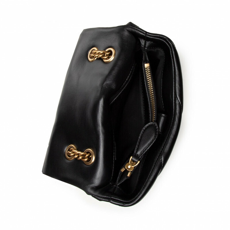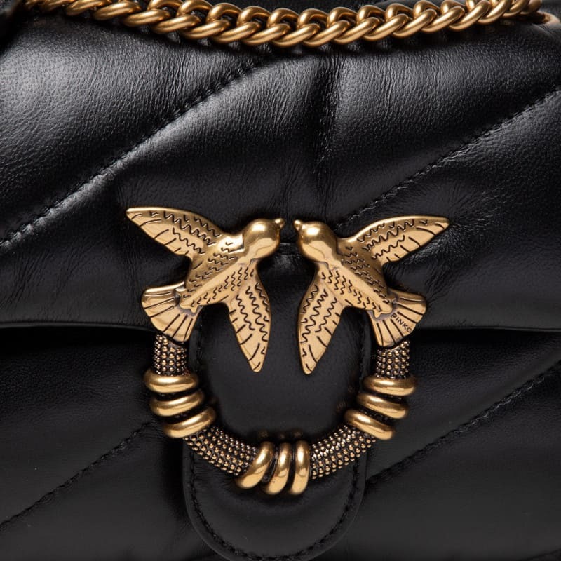 Мини-сумка Love Bag Puff из мягкой кожи наппа с крупным диагональным стеганым узором. Застежка дополнена легендарной пряжкой Love Birds Diamond Cut из металла с гальваническим покрытием цвета античного золота и спиралевидными деталями. Внутреннее отделение на подкладке из микрофибры включает карман-перегородку на молнии и плоский карман. Плечевой ремень длиной 110 см представляет собой комбинацию классической металлической цепочки с круглыми звеньями и практичного наплечника из кожи наппа.