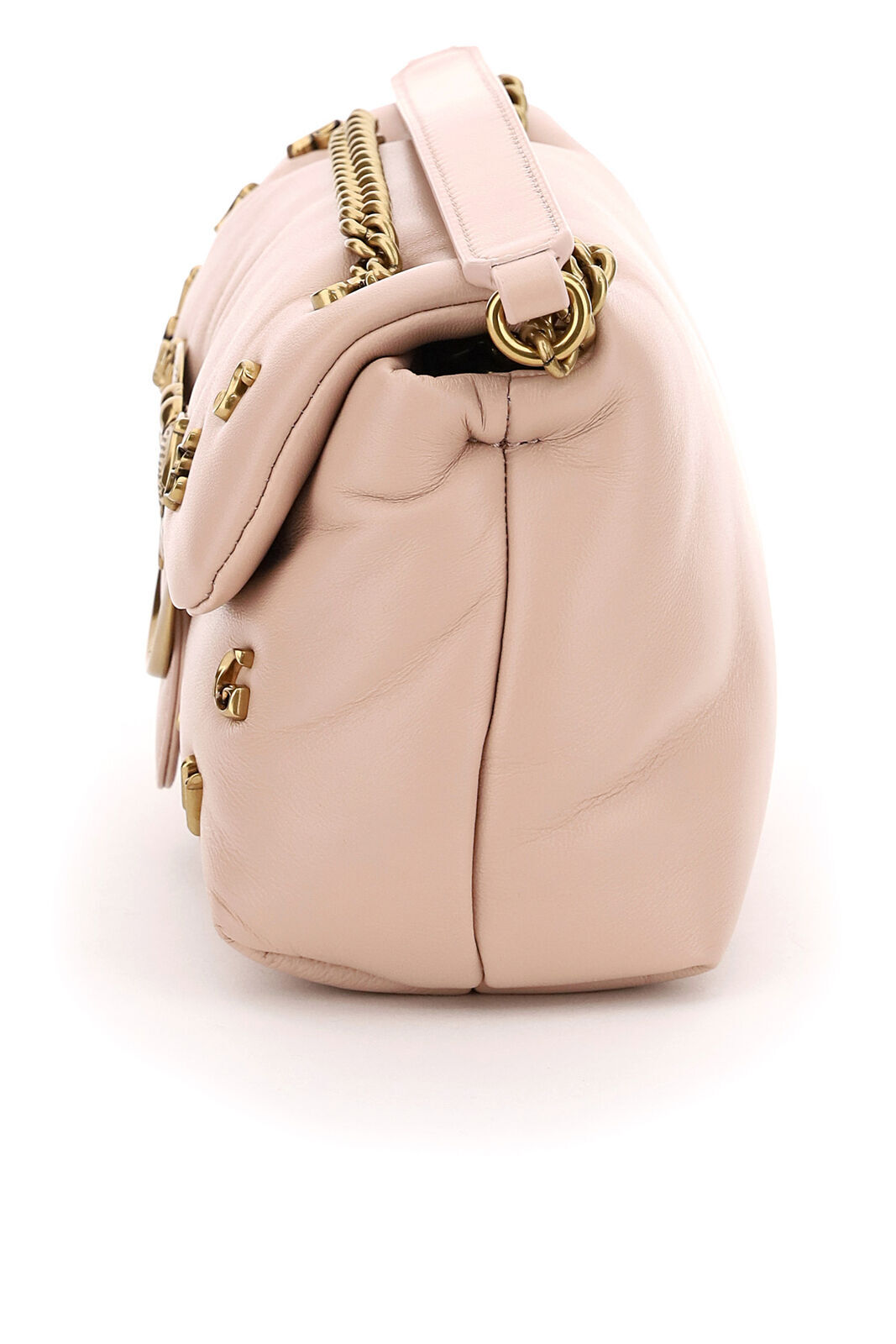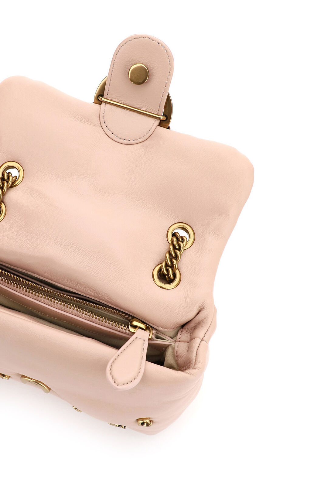 Сумка Mini Love Bag Puff из мягкой кожи наппа, украшенная металлическими значками-буквами, образующими надпись "Pinkoness Calling". Застежка дополнена легендарной металлической пряжкой Love Birds с гальваническим покрытием "античное золото". Внутри сумка обшита микрофиброй, разделена карманом-перегородкой на молнии и снабжена карманом на стенке. Плечевой ремень длиной 110 см представляет собой комбинацию классической металлической цепочки с круглыми звеньями и практичного наплечника из кожи наппа. Проверьте подлинность своей Love Bag при помощи особого NFC-чипа или кода Certilogo, напечатанного на специальной бирке в форме сердечка.