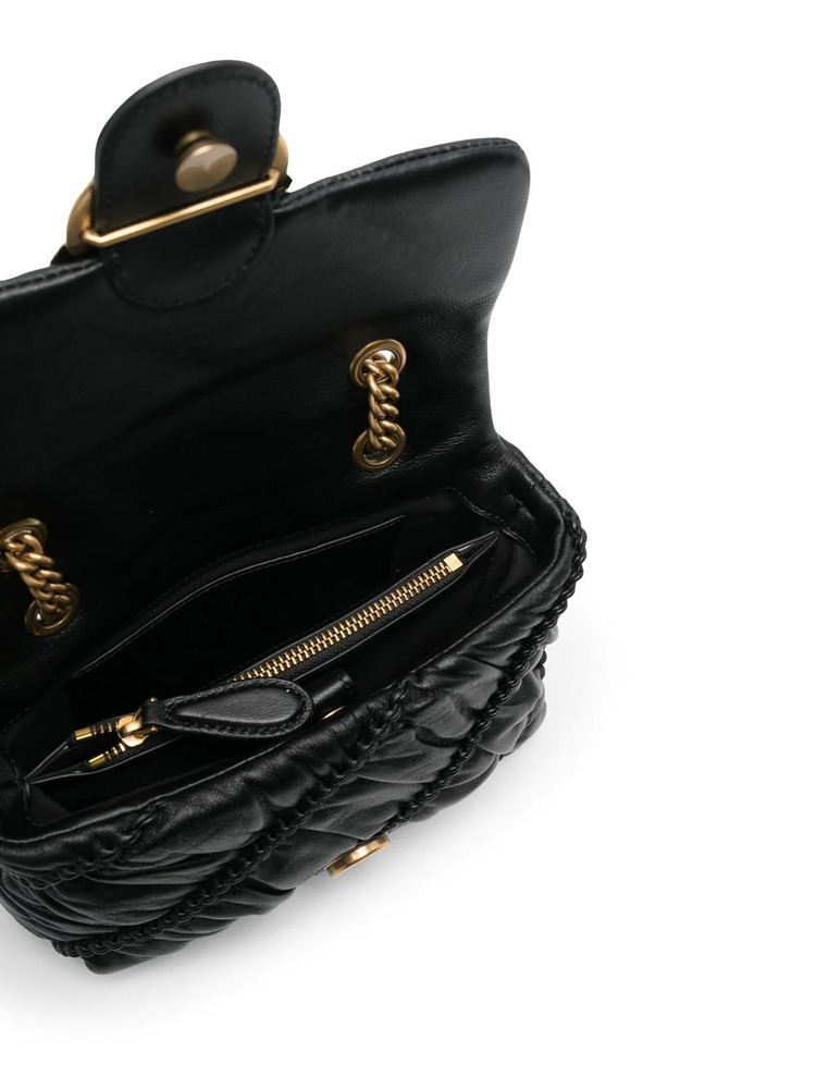 Мини-сумка Love Bag Puff из кожи наппа отличается оригинальным узором с эффектом сборки. Застежка украшена легендарной пряжкой Love Birds Diamond Cut из металла. Внутреннее отделение на подкладке из микрофибры дополнено карманом-перегородкой на молнии и плоским карманом. Плечевой ремень представляет собой комбинацию классической металлической цепочки и практичного наплечника из кожи наппа.#nbsp;