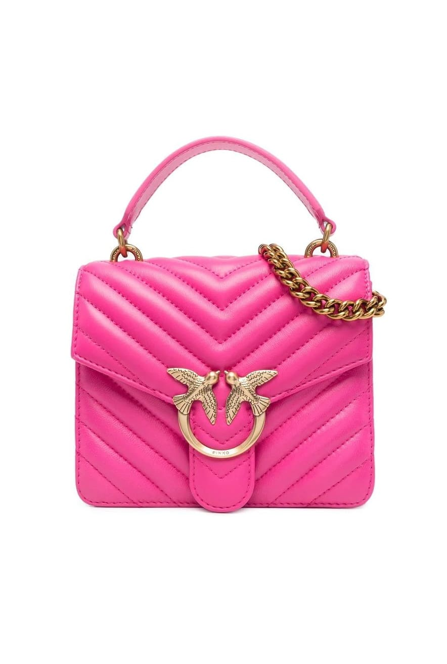 Мини-сумка Love Bag Top Handle выполнена из кожи наппа со стеганым шевронным узором. Застежка с клапаном дополнена легендарной металлической пряжкой Love Birds Diamond Cut. Внутреннее отделение на подкладке из микрофибры. Дизайн завершают кожаная ручка сверху и съемный плечевой ремень в виде металлической цепочки с круглыми звеньями и регулируемым наплечником из кожи наппа.