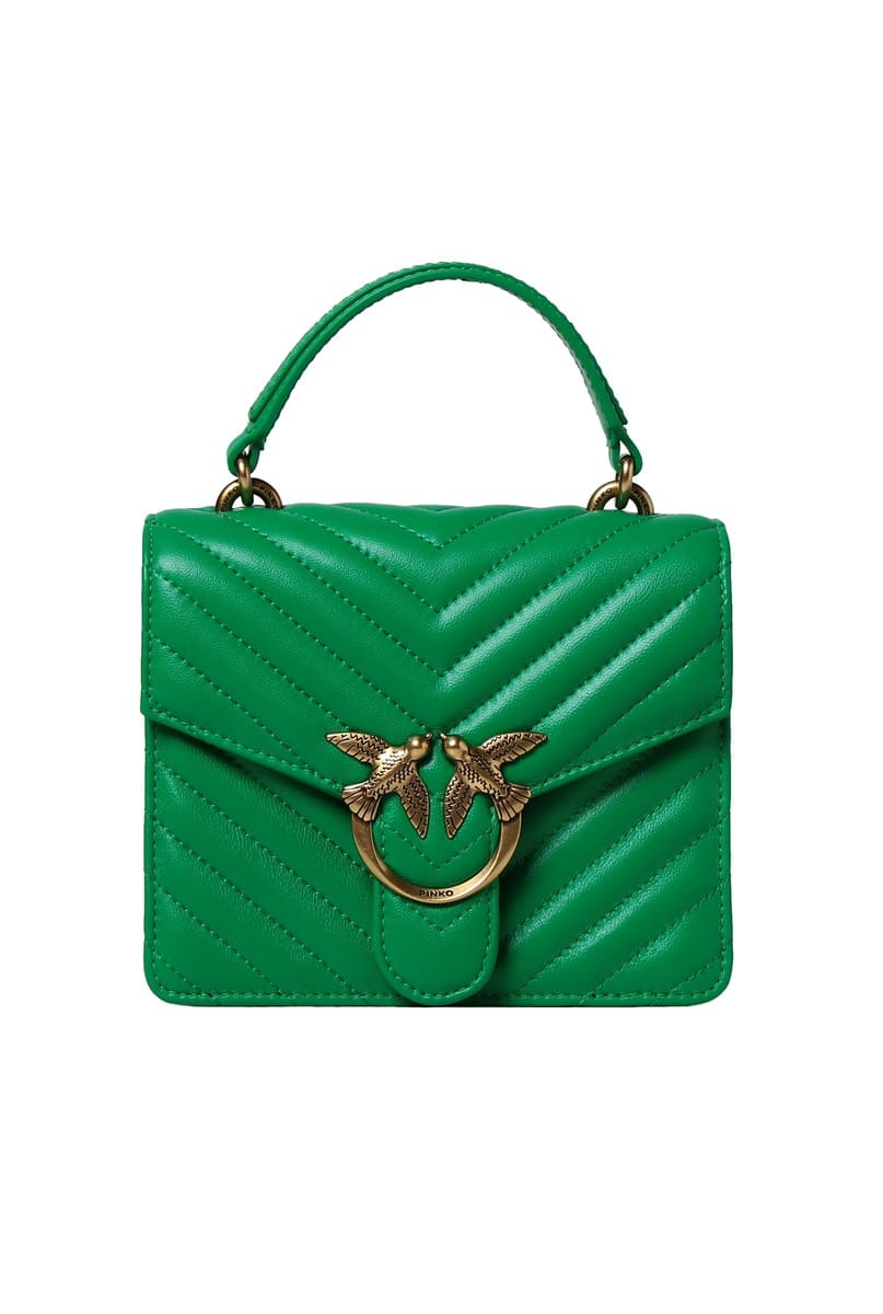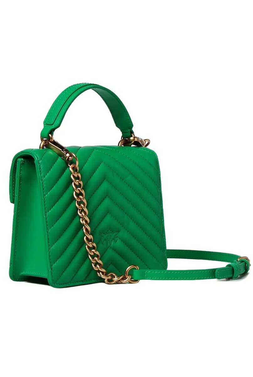 Мини-сумка Love Bag Top Handle выполнена из кожи наппа со стеганым шевронным узором. Застежка с клапаном дополнена легендарной металлической пряжкой Love Birds Diamond Cut. Внутреннее отделение на подкладке из микрофибры. Дизайн завершают кожаная ручка сверху и съемный плечевой ремень в виде металлической цепочки с круглыми звеньями и регулируемым наплечником из кожи наппа.#nbsp;