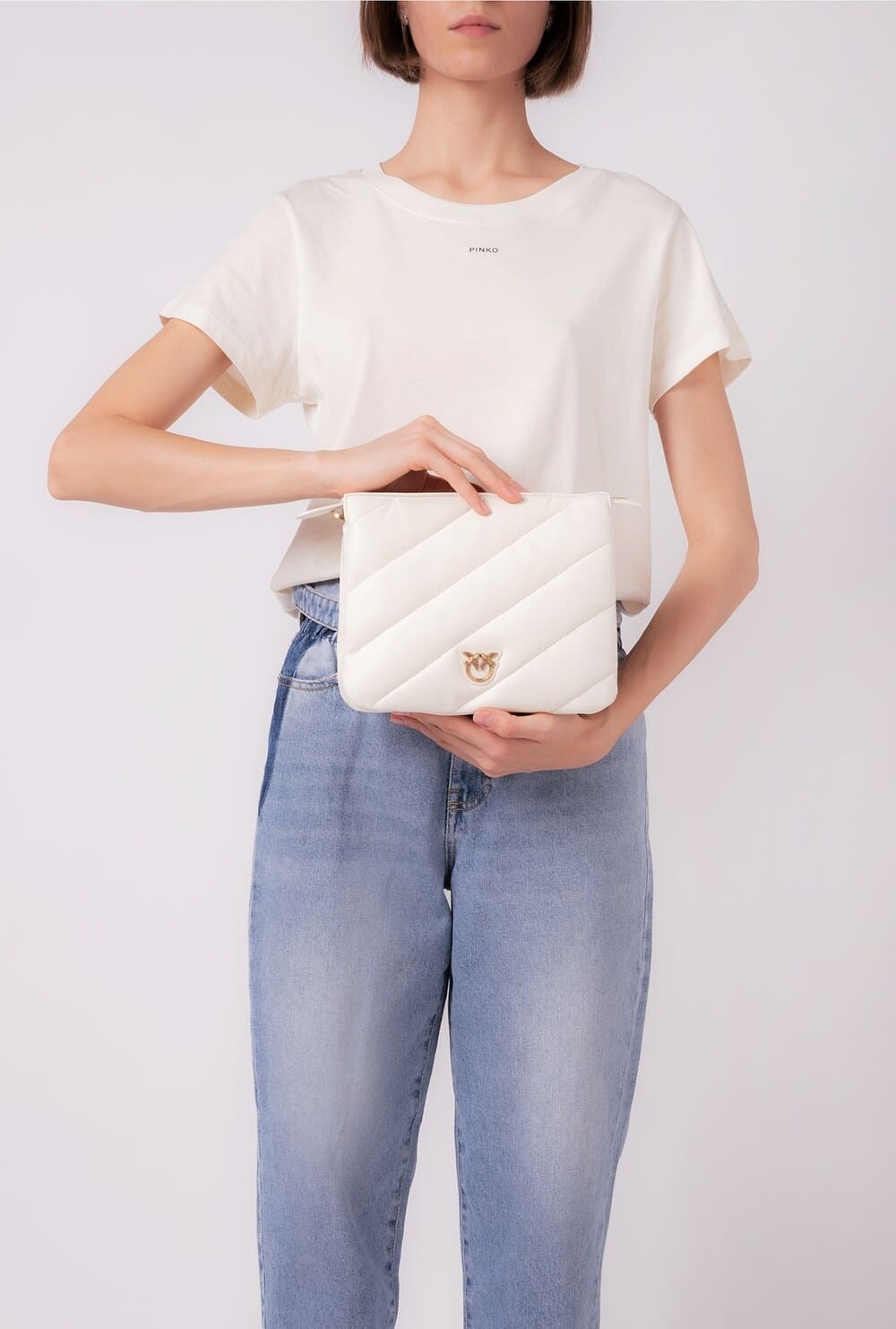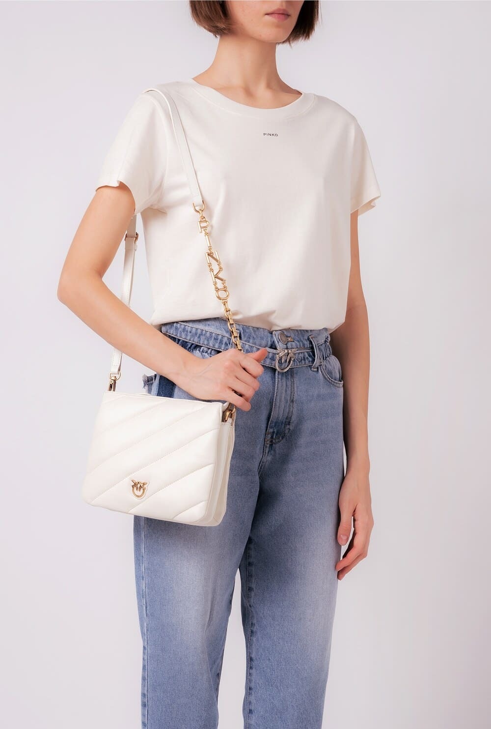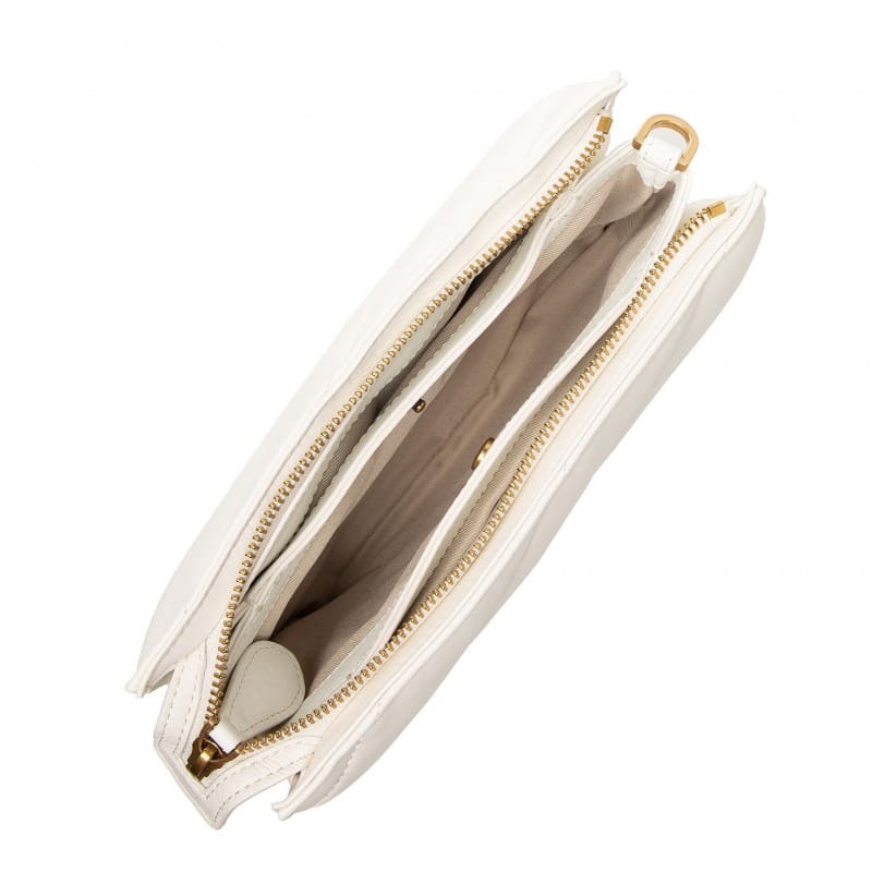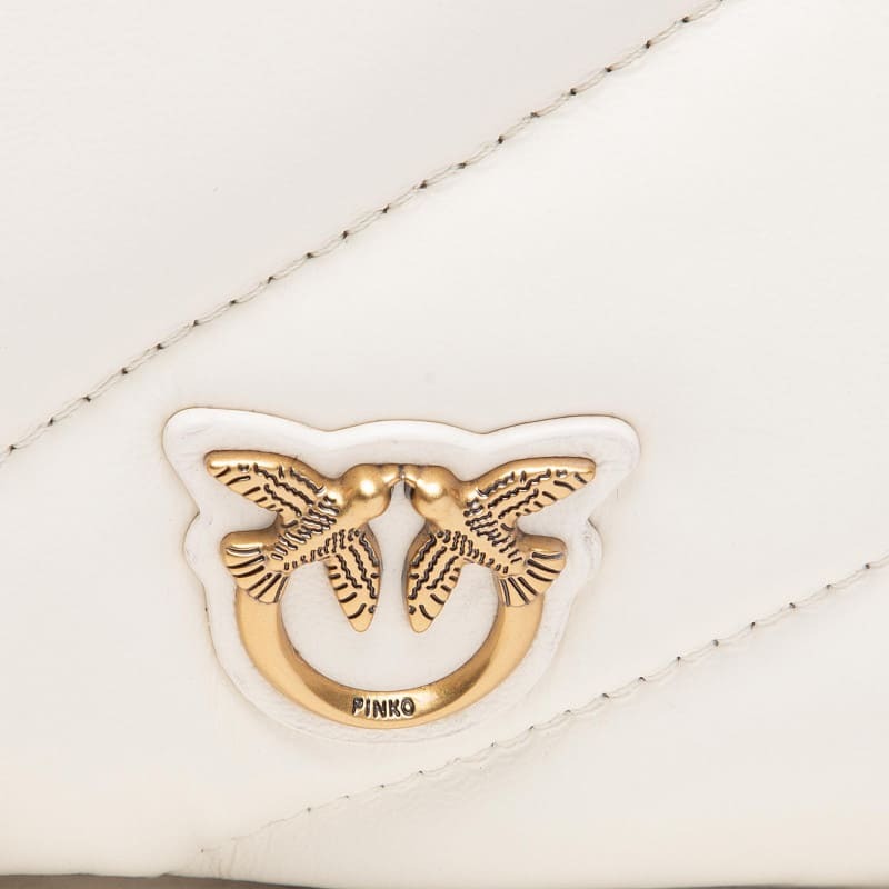 Маленькая сумка Twins Bag с тремя отделениями выполнена из мягкой стеганой кожи наппа с крупным диагональным узором. Дизайн дополняет эмблема Love Birds Diamond Cut из металла на основе из кожи спереди. Модель на подкладке из микрофибры. Съемный плечевой ремень представляет собой комбинацию практичного наплечника из кожи и металлической цепочки с квадратными звеньями и надписью PINKO. Застежка-молния с бегунками из кожи наппа.
