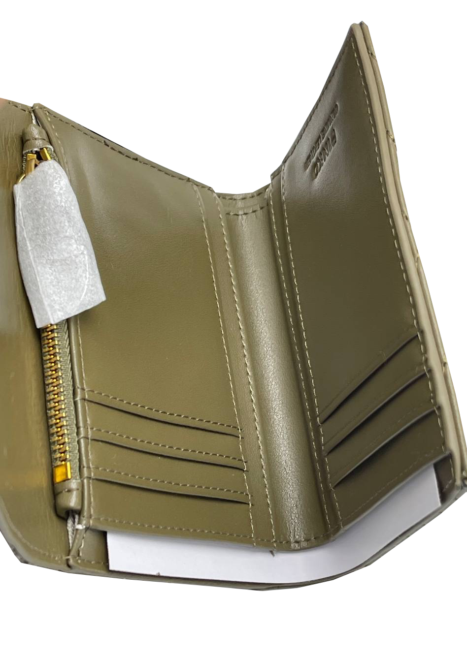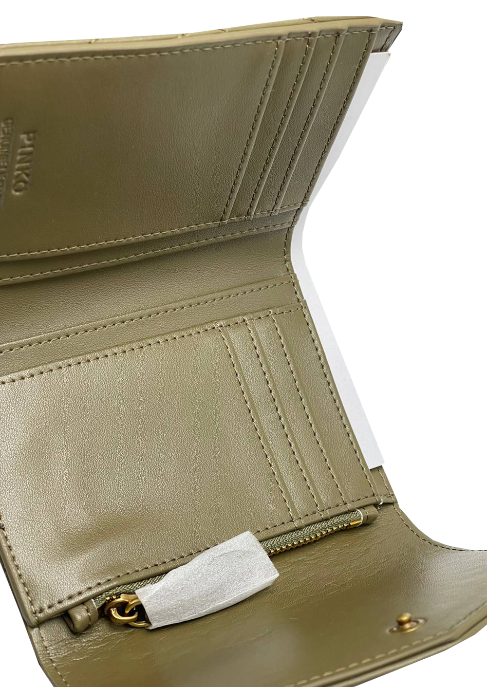 Золотистый металлический логотип, стеганая модель, внутренние отделения для карт, отделение для купюр, отделение для монет и кожаная подкладка.